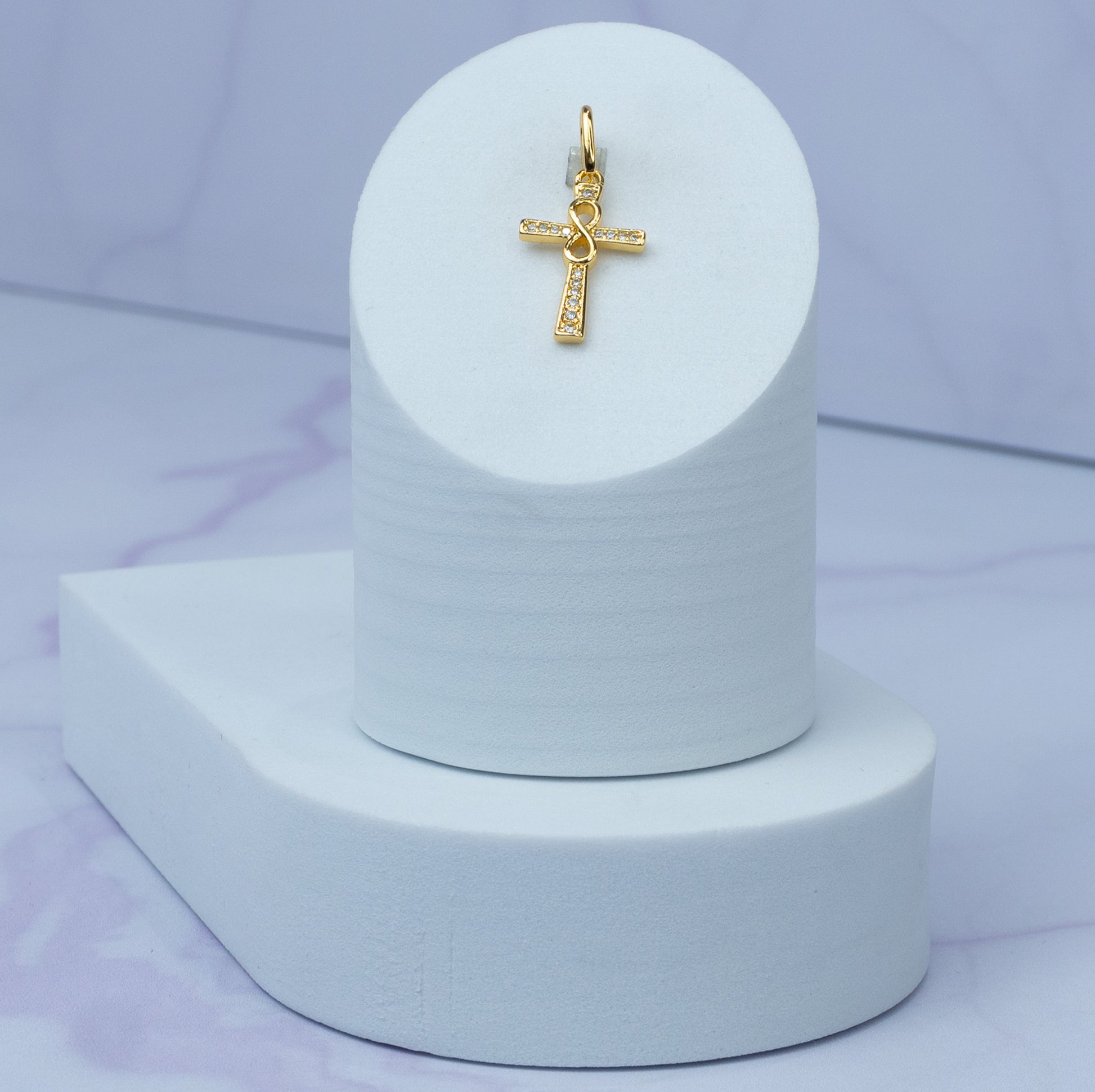 Dije Cruz Infinity con circones cristal, con un alto de 2 cm y un ancho de 1.5 cm